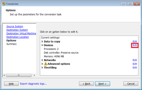 I’m not sure why VMware recommended that workaround when a much easier alternative is available: changing the destination disk controller type. To do this, start the conversion wizard. On the Options screen, click the Devices Edit link.